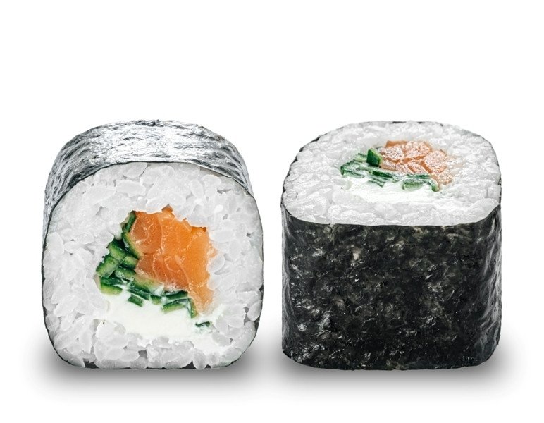 Лосось, свежий огурчик и сливочный сыр завернуты в нежный вкусный рис и лист нори