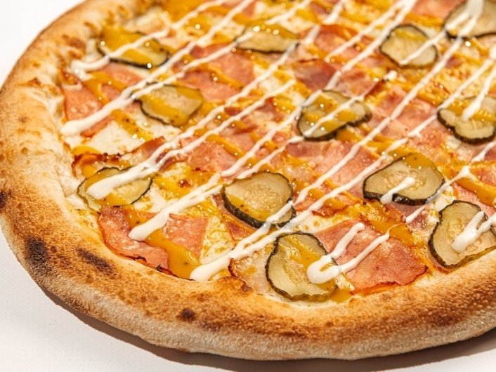Сыр моцарелла , горчичный соус , плавленный сыр , бекон, ветчина , маринованные огурчики
