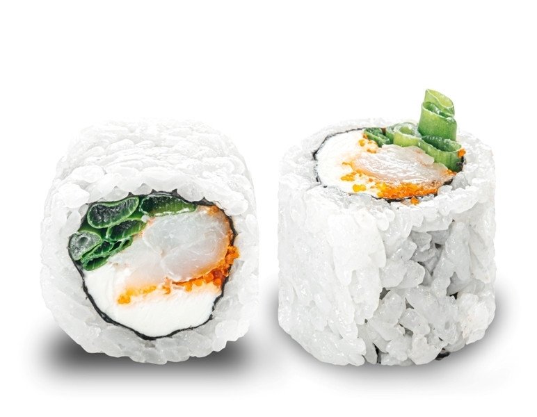 Японский рис, нори, сливочный сыр, креветка, зеленый лук, икра масаго. Порция 6 кусочков