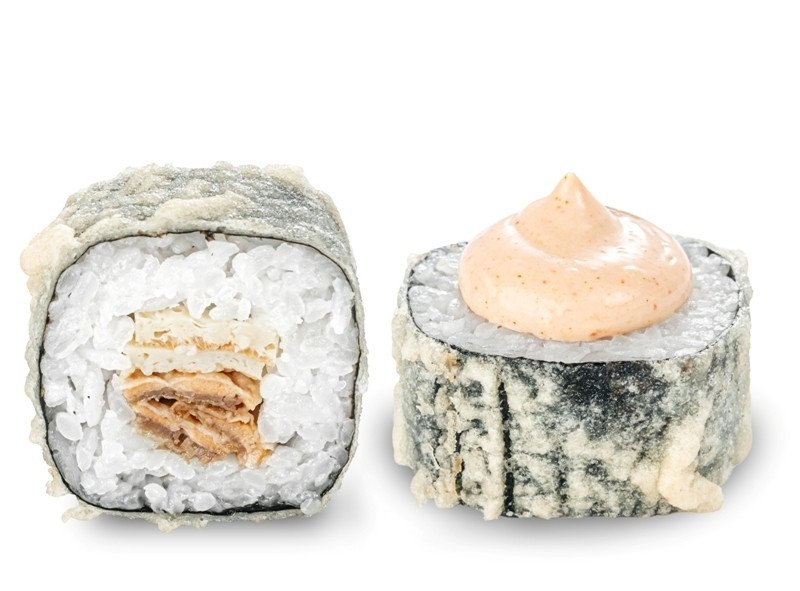 Японский рис, нори, жареный лосось, японский омлет, кляр, украшается соусом кимчи