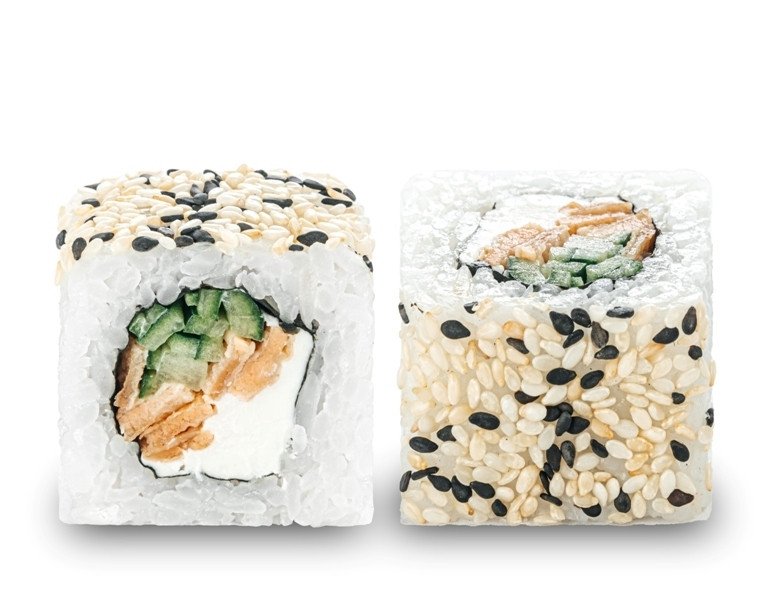 Японский рис, нори, жареный лосось, сливочный сыр, свежий огурчик, кунужт